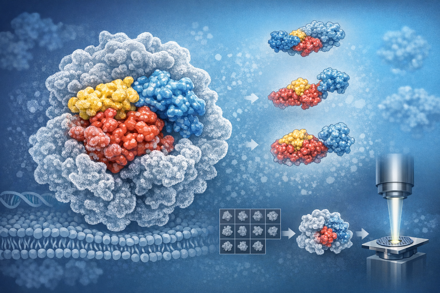 The study applies single-particle cryo-electron microscopy to characterize the conformational ensemble of full-length, fully active rat cytochrome P450 reductase (CPR) in solution. The work addresses the unresolved relationship between available crystal structures and the solution-state conformations that underlie CPR-mediated interflavin and cytochrome electron transfer. A 3.3 Å reconstruction of the 77 kDa enzyme is reported, representing the first electron microscopy structure for this size class and enabling comparison between compact solution conformers and extant crystallographic models.