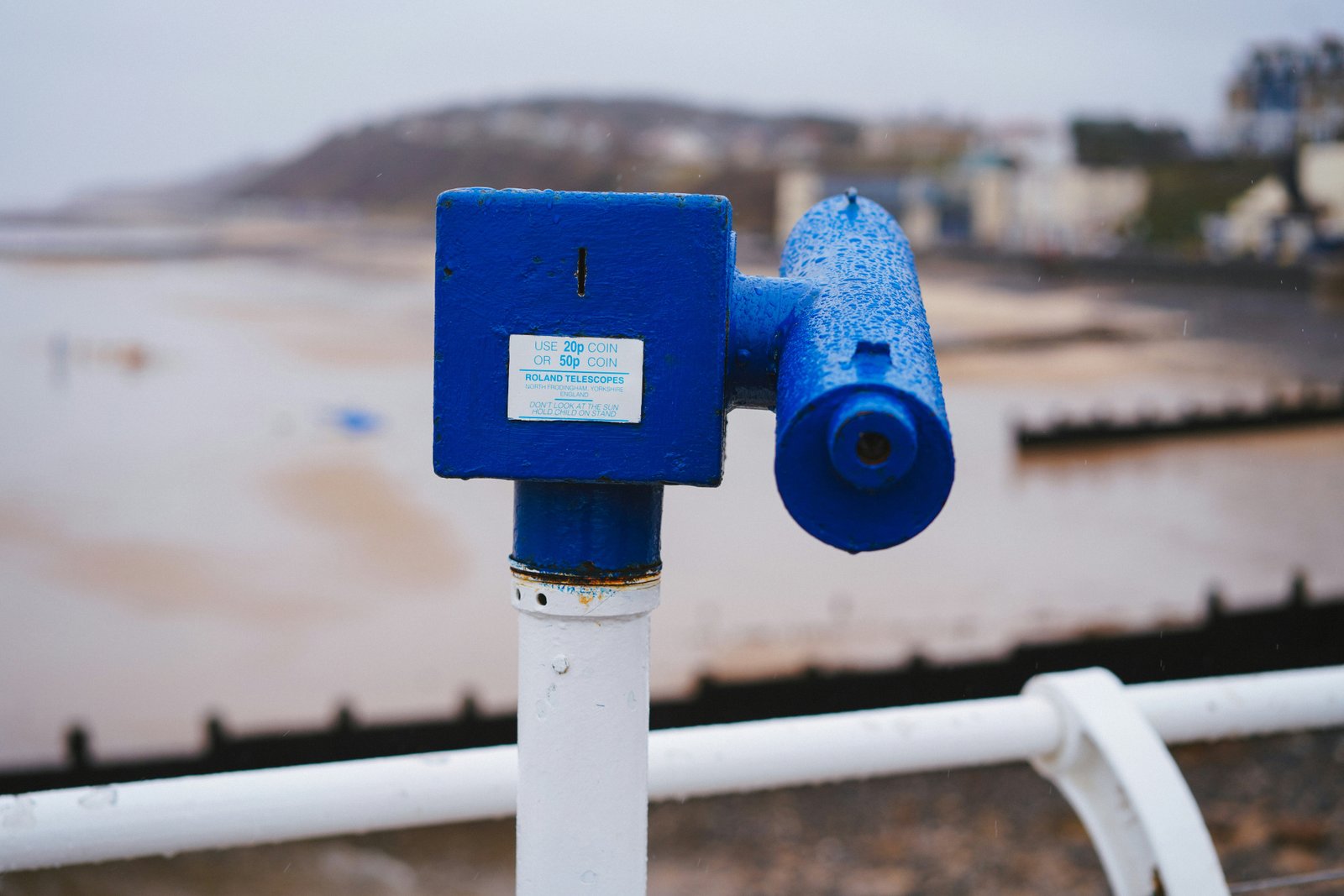 A blue atmospheric monitoring device mounted on a white railing with a coastal landscape, beach, and harbor visible in the soft-focus background.